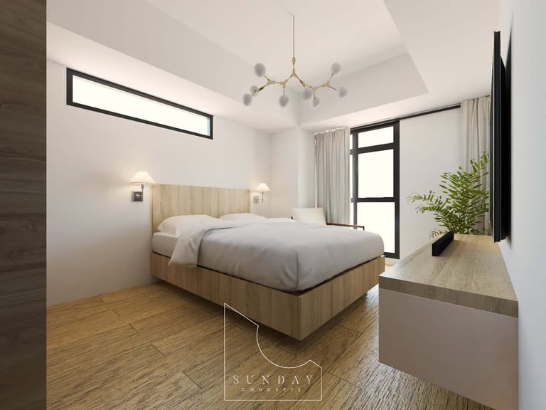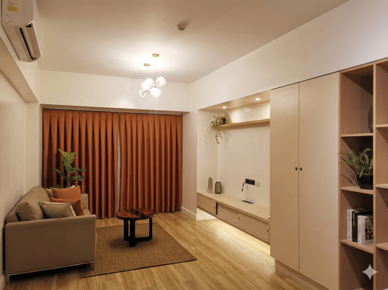 "This one-bedroom sanctuary was thoughtfully designed for two seniors seeking a peaceful, restorative home. Inspired by the warmth of a tropical vacation, the space blends a 'bakasyon' aesthetic with modern minimalism. The layout is intentionally streamlined to ensure ease of movement and minimal maintenance, creating a visually soothing environment where comfort meets effortless living."